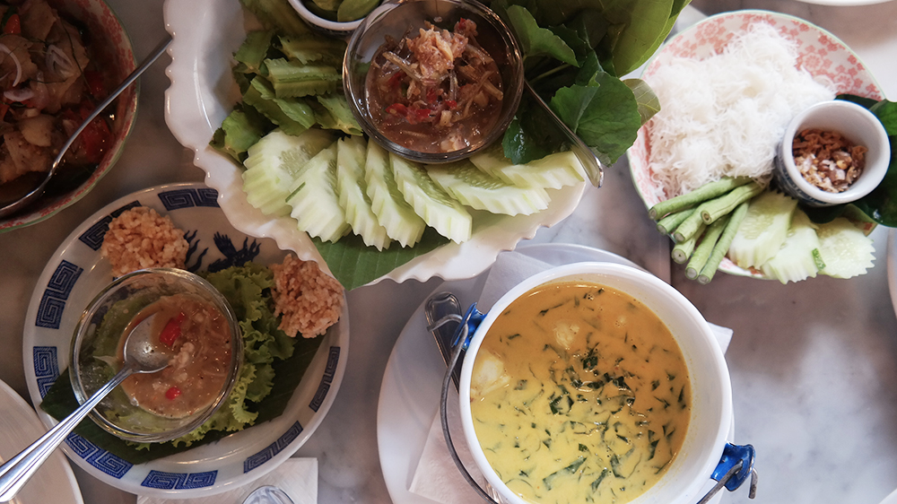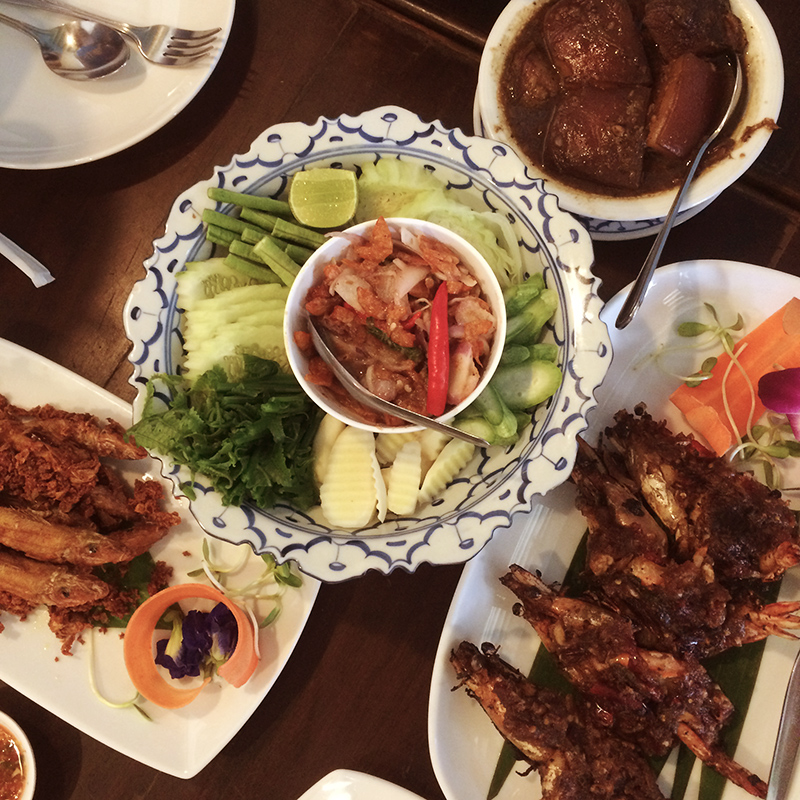 มื้อสุดท้ายก่อนบินกลับ พี่ที่ไปด้วยกันบอกว่ามีร้านเพื่อนอยากชวนไปกินกัน เราก็เออ ออ ไปไป ร้านวันจันทร์ ร้านนี้ตกแต่งน่ารัก ชอบมาก เป็นสไตล์เรโทร มีการเอาเครื่องฉายหนังสมัยก่อนมาตกแต่งด้วย ที่นี่เป็นอาหารพื้นเมืองภูเก็ตอีกเช่นเคย ก็ติดใจอะ เดี๋ยวจะไม่ได้มาภูเก็ตอีกนาน เลยต้องกินตุนไว้ มีแกงปูเส้นหมี่ กุ้งคุณย่า หลนปู หมูฮ่อง แบบจัดใส่เป็นพานมาเลย แกงปูนี่กลายเป็นของเด็ดประจำภูเก็ตไปแล้ว ถ้ามาอีกต้องกิน คือเพิ่งเคยกินครั้งแรกจากทริปนี้แหละ กุ้งคุณย่านี่ก็ดีอะ เป้นกุ้งทอดราดซอสซักอย่าง เหมือนกินไก่บอนชอน แต่เปลี่ยนไก่เป้นกุ้งแทน