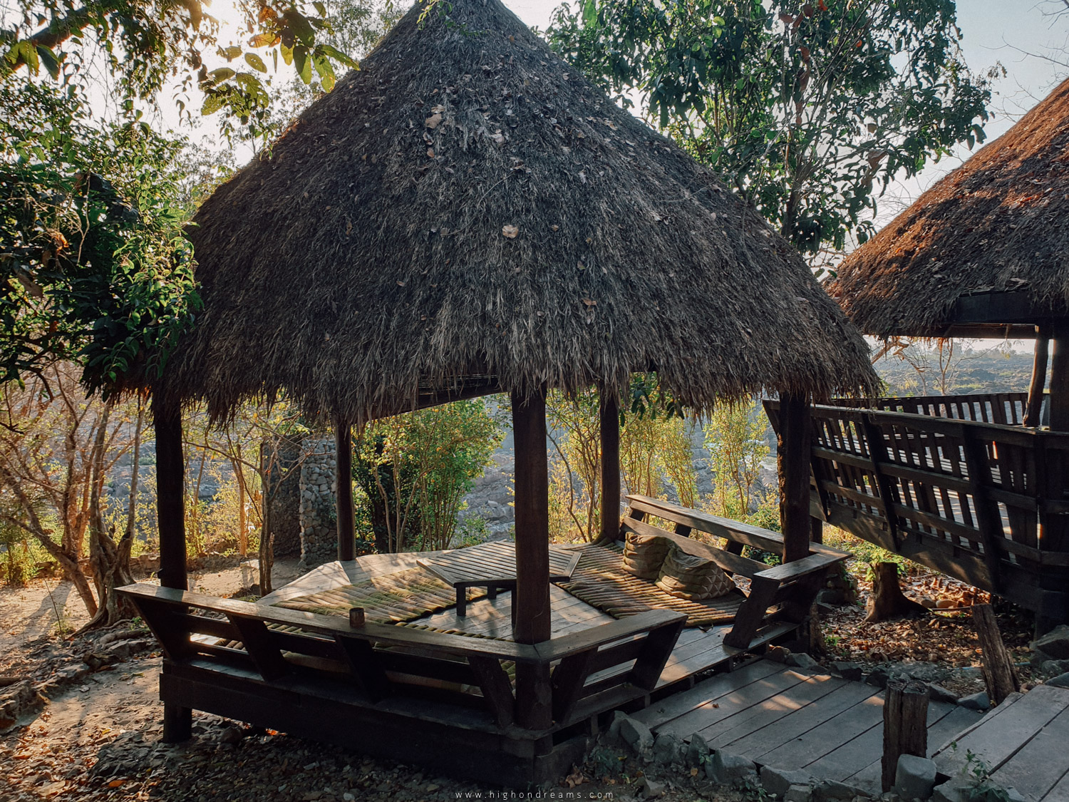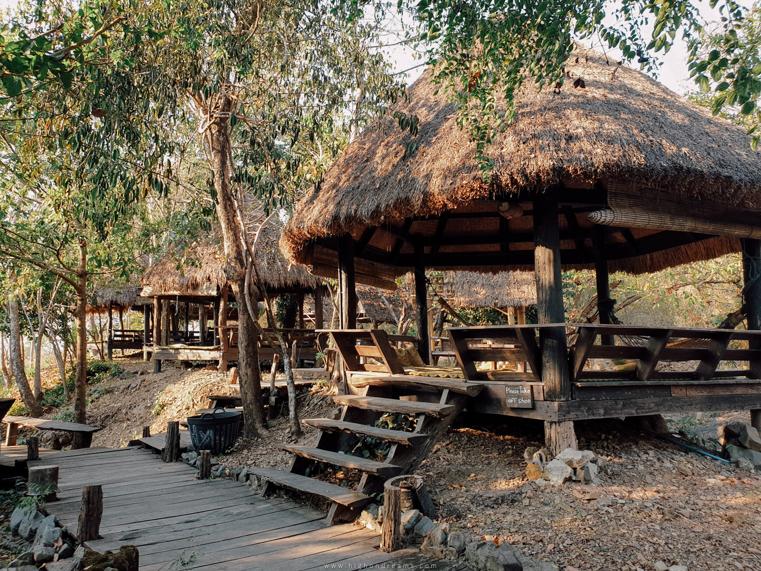 เราเดินตามป้ายไปจนสุดน้ำตก ไกลสุด ลึกสุด ไม่ใช่ใกล้ๆเลยเด้อ จะเห็นซุ้มมุงจาก พร้อมมีโต๊ะ และเบาะนั่งชิล นับสิบซุ้ม ที่นี่เป็นร้านอาหาร บาร์ ฟรี wifi มีโต๊ะสนุ๊กด้วย ตอนที่เรามานี่คนน่าจะกลับกันหมดแล้ว ไม่มีซุ้มไหนมีคนเลย เราเลยเดินไปสั่งเบียร์ที่บาร์แล้วหามุมนั่งเสพย์บรรยากาศน้ำตกชิลๆ