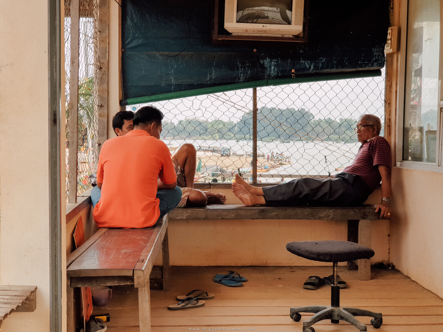ความซวยของการมาคนเดียวคือ เรือรอผู้โดยสารเพิ่มก่อนเรือถึงจะออก ไอ่เราก็คิดว่าจะมีคนมาขึ้นเรือเรื่อยๆ ก็เลยลองรอดู รอจนครึ่งชม. ก็ยังไม่มีคนมาจ้า พอตัดสินใจจะเหมาไป ลุงขายตั๋วแกก็บอกให้รอก่อน อดทนหน่อยหนู จร้าาาา ศักดิ์ศรีค้ำคอ ไม่อยากให้ลุงเห็นว่าไม่มีความอดทน (ลุงกูก็ไม่ใช่) รอมาก็นานแล้วรออีกจะเป็นไร สรุป รอไปชั่วโมงครึ่ง มีกรุ๊ปฝรั่งที่เดินทางข้ามมาจากกัมพูชามาพอดี