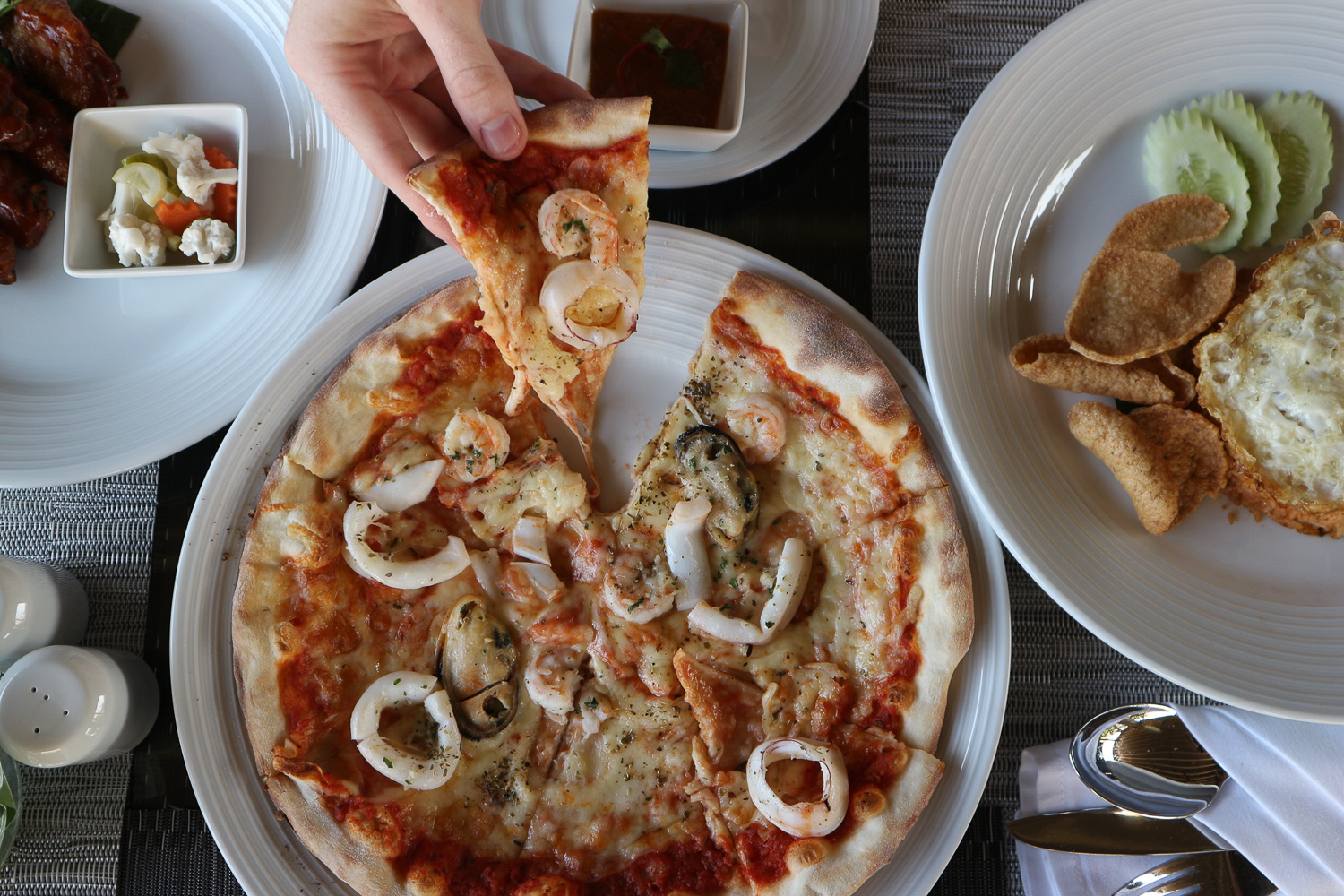 อาหารกลางวันของที่นี่ไม่เลวเลย มีเมนูหลากวัฒนธรรม หลากประเทศ เราลอง Marinara Pizza เป็นพิซ่าทำสดๆจากเตาเลย (แอบเห็นเตาถ่านตอนเดินเข้ามา), Buffalo Wing และ Mee Goreng ผัดหมี่สไตล์อินโด แต่หมี่หมดเลยเปลี่ยนเป็นข้าว Nasi Goreng แทน อร่อยอยู่เด้อ แต่เราชอบพิซซ่าสุด กุ้งเต็มปากหมึกเต็มคำ