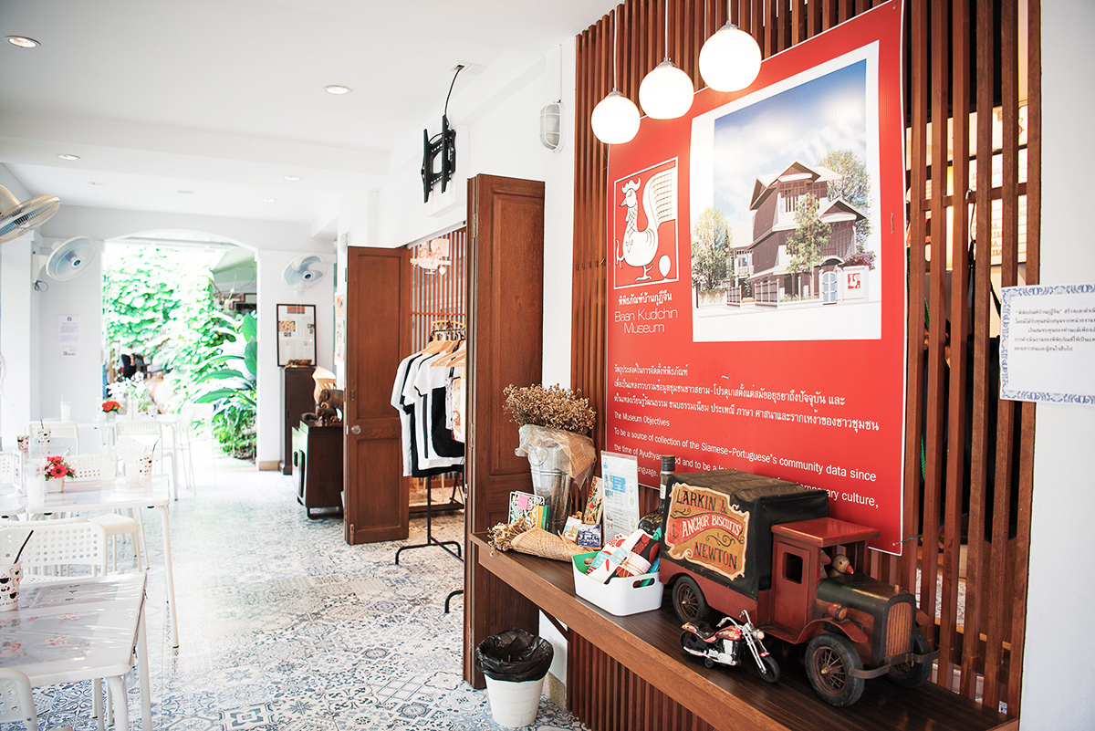 ใครจะไปคิดว่าซอยเล็กๆนี้ ลึกเข้าไปอีก จะมีคาเฟ่เล็กๆน่ารักๆ ซ่อนอยู่ ที่นี่เป็นคาเฟ่ที่ดัดแปลงมาจากบ้านไม้เก่า และยังทำเป้นพิพิธภัณฑ์บ้านกุฎีจีน ที่รวบรวมข้อมูลชุมชนชาวสยาม-โปรตุเกส ตั้งแต่สมัยอยุธยาจนถึงปัจจุบัน ทุกสิ่งหย่างตั้งแต่รากเหง้าของชุมชน (เค้าเขียนไว้งี้นะ ฮ่าๆ)