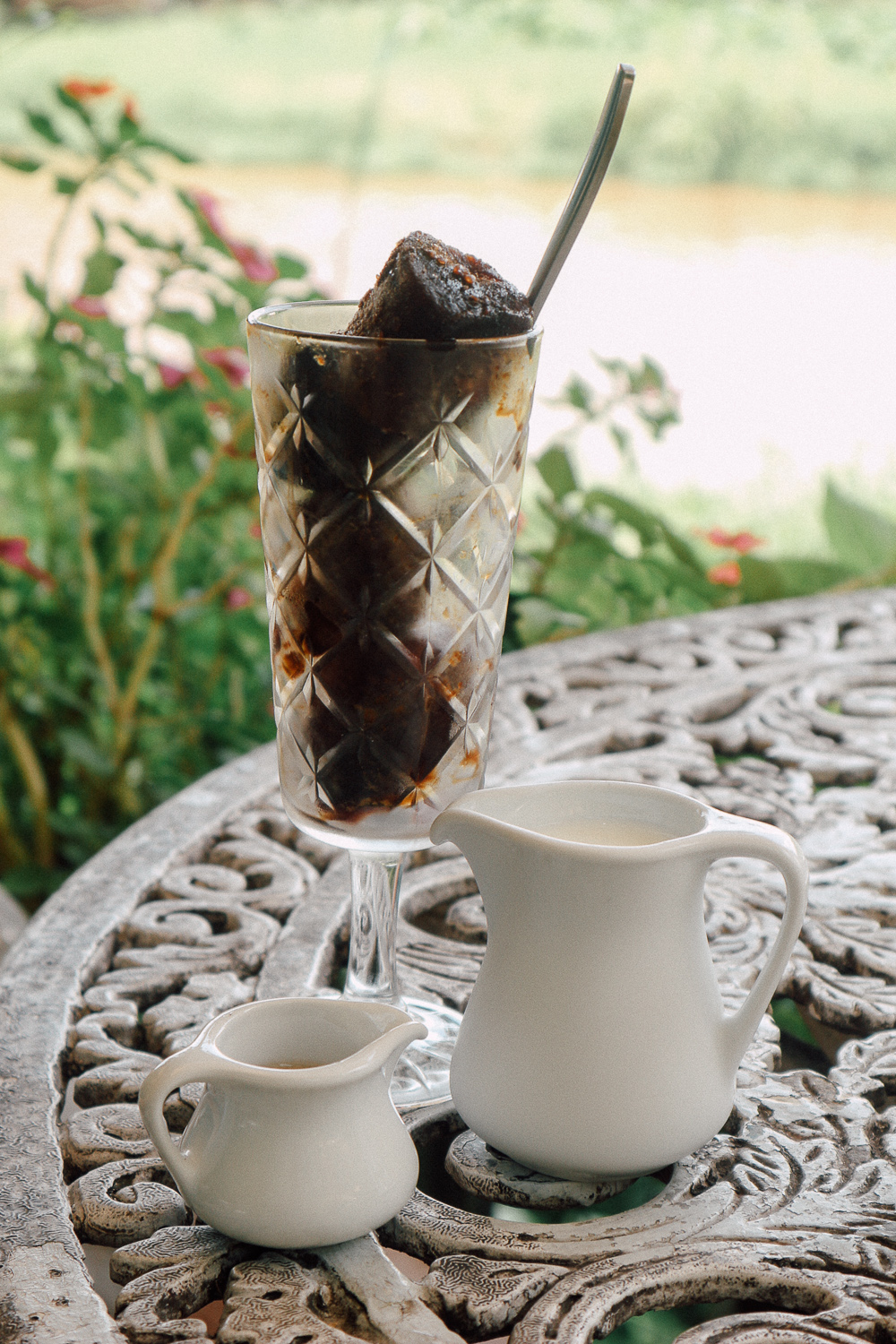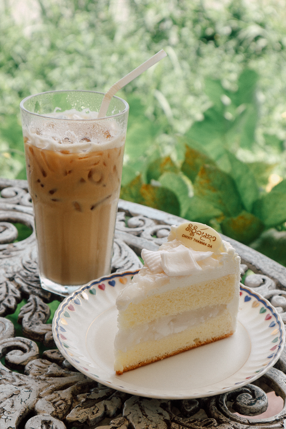 นอกจากสถานที่สวยๆแล้ว เครื่องดื่มขนมก็ดีไม่แพ้กัน เราลองสั่งกาแฟชีวิตธรรมดา เป็น Signature ของที่นี่ มันเป็นเหมือนก้อนน้ำแข็งกาแฟ เสริฟคู่กับนมและไซรัป พอเราราดนมลงไปตัวเกร็ดกาแฟน้ำแข็งจะละลายผสมกับนมพอดี เป็นกาแฟเย็นที่มีเทคนิคการดื่มมากกว่าเดิม ฮ่าๆ