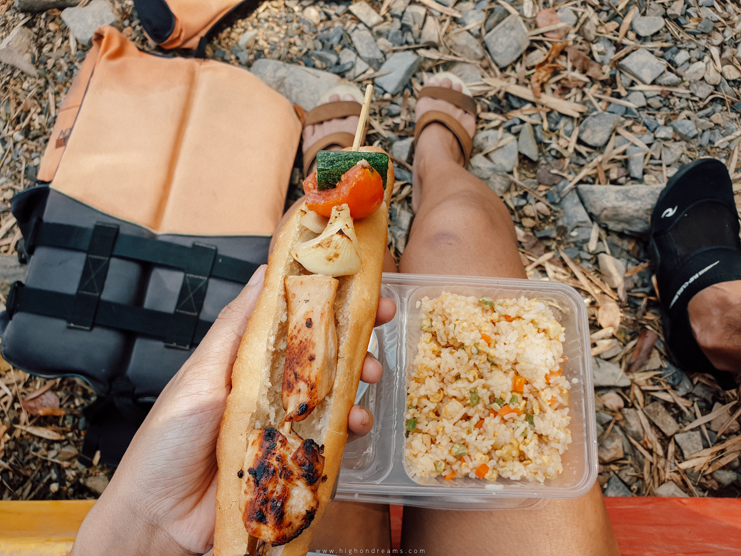 เราพายเรือกันประมาณ 1 ชั่วโมง (ก็นานอยู่นะ) ก็จอดพักข้างทาง ที่จอดข้างทางไม่ใช่ไร คือมีคนเรือล่ม แล้วต้องจอดรอ มีพี่ไกด์ลาว 3 คนดูแลพวกเราอย่างดี คนนึงออกไปช่วย ที่เหลือก็เตรียมก่อไฟทำอาหารกลางวัน ทำกันตรงนั้นแหละ Random มาก