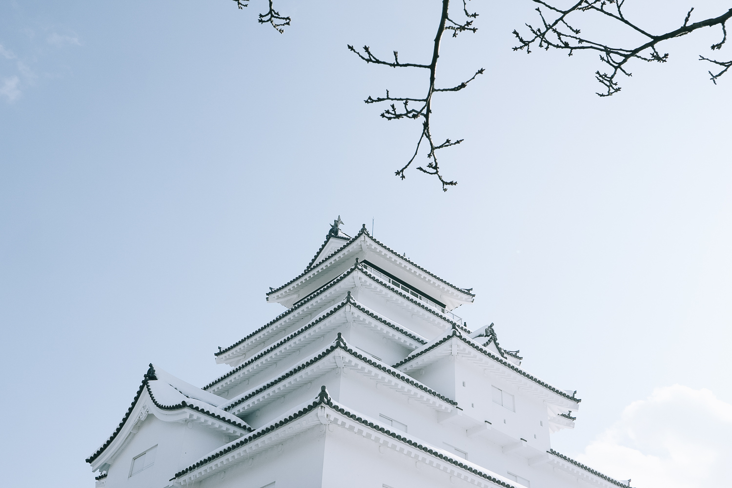 ปราสาทนกกระเรียนแดง วันนี้เป็นสีขาว เพราะหิมะปกคลุม ปราสาทนี้ถูกสร้างขึ้นตั้งแต่สมัยเอโดะ คือสร้างไว้นานมากๆ แต่วันนึงก็ถูกทำลายลงจากสงครามโบชิน ซามูไรกลุ่มสุดท้ายในญี่ปุ่นได้ปลิดชีพตัวเองลง ณ ปราสาทแห่งนี้ (อื้อหืออ) แล้วเพิ่งจะถูกรีโนเวทใหม่เสร็จเมื่อปี 2011 ที่ผ่านมานี้ แต่เปลี่ยนจากไม้เป็นคอนกรีต และจาก 7 ชั้น ลดลงเหลือ 5 ชั้น แต่ยังคงรูปแบบกระเบื้องหลังคาไว้เป็นแบบญี่ปุ่นดั้งเดิมอยู่