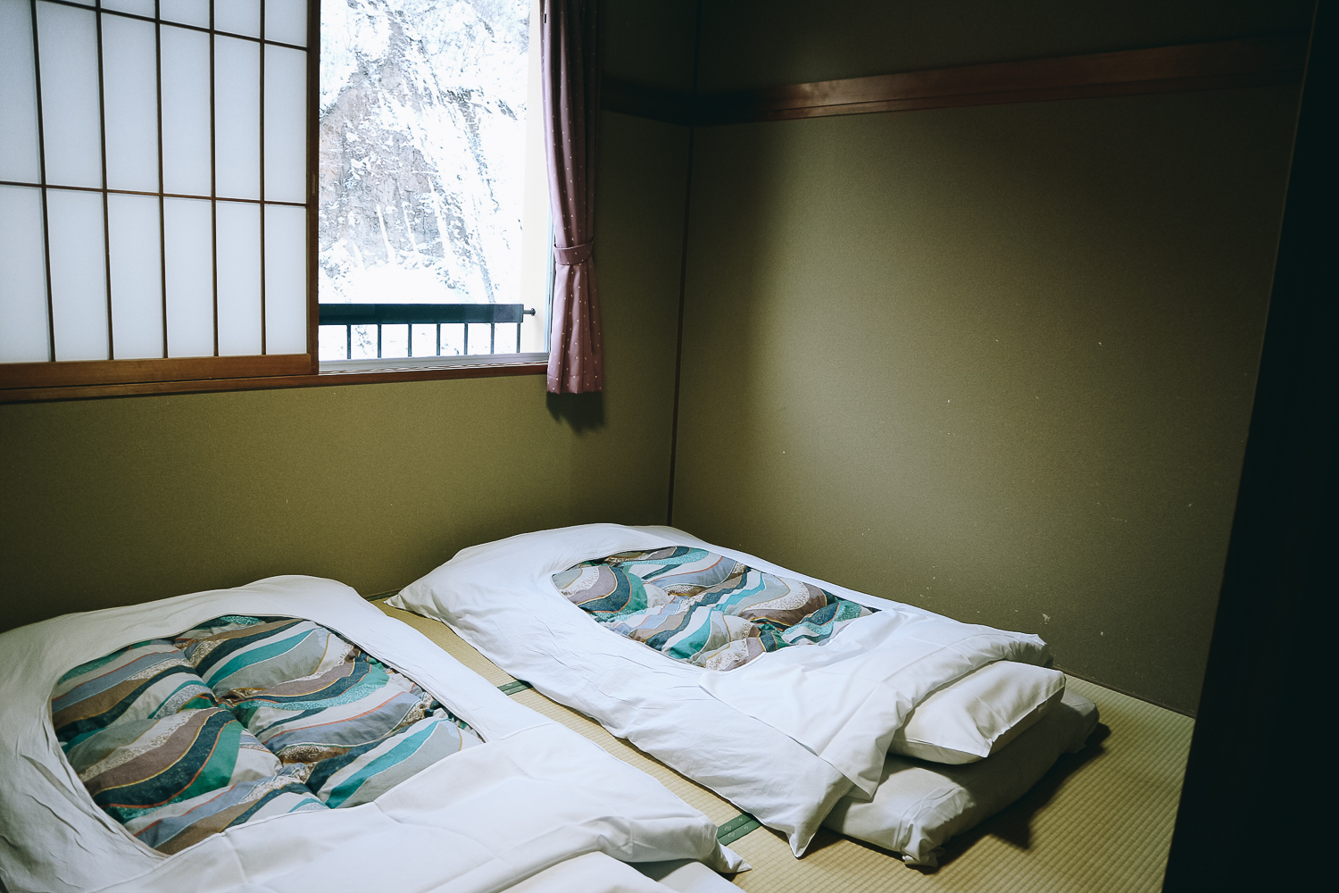 เราจองที่นี่เพราะมันมีห้อง 4 เตียง เอาไว้นอนเม้ามอยกันกับเพื่อนๆได้สะดวก ห้องนอนที่นี่เป็นแบบเรียวกัง แต่ไม่กังนะ มี 2 ห้องนอน เป็นฟูกหนาๆปูบนพื้นเสื่อญี่ปุ่น และมีฮีทเตอร์ให้ด้วย คืนนี้หนาวมากแน่นอนค่ะ ไม่ต้องสืบ