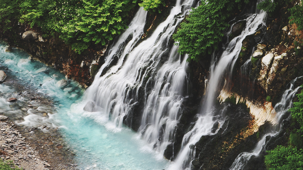 ไม่ไกลจากบ่อน้ำสีฟ้า มีน้ำตกชิโรฮิเงะ น้ำตกนี้เป็น 1 ใน 5 ของน้ำตกที่สวยที่สุด บนเกาะฮอกไกโด สูงประมาณ 30 เมตร ความพิเศษของมันคือ มันเป็นน้ำบาดาลที่ไหลออกมาจากรอยแตกของหน้าผา เป็นเส้นๆ สีขาว ไหลลงสู่แม่น้ำบิเอะ จนทำให้บางคนก็เรียกน้ำตกนี้ว่าน้ำตกหนวดขาว เห็นแล้วอยากโดดลงไปเล่นจริงๆ