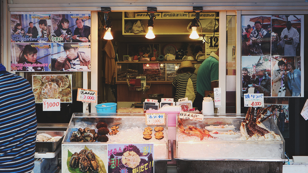 เช้าวันนี้เปลี่ยนบรรยากาศจากสามวันก่อนๆเลย เพราะเราอยู่ในเมือง มาเสพย์รสชาติของเมืองบ้างหลังจากอยู่แต่กับธรรมชาติ 555 การได้มาเดินตลาดเช้ากลางเมืองก็เป็นไอเดียที่ไม่เลว ตลาดเช้าฮาโกดาเตะ ส่วนใหญ่เป็นอาหารทะเลสดๆ เช่น ปูคานิ ไข่ปลาแซลมอน หอยเชลล์ หอยเม่นทะเล และหอยนางรมย่างของโปรด เรียกได้ว่าเป็นสวรรค์ของสายหอยเลยจริงๆ ฮ่าๆๆ นอกจากนั้นก็ยังมีเมล่อนและผลไม้ต่างๆด้วย เพราะฉะนั้นเตรียมท้องมาให้ดีๆ
