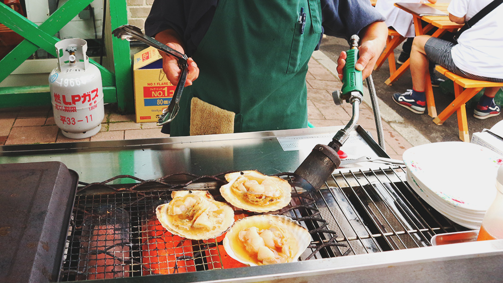 ไกด์พาพวกเราไปลองกินหอยเชลล์และหอยนางรมย่าง ร้านเด็ดที่แกเคยพาลูกค้ามาหลายคนแล้วติดใจ พอเลือกหอยปุ๊ปแม่ค้าก็แงะหอยย่างข้างหน้าเราเลย ในร้านมีที่นั่งเล็กๆ 2-3 โต๊ะ ย่างเสร็จเสริฟทันทีตอนร้อนๆ สดมากๆ ฉ่ำมากๆ ส่วนไข่หอยเม่นนี้กินดิบๆเลยไม่ต้องย่าง เหยาะโชยุและวาซาบิลงไปนิดหน่อย อร่อยเลย