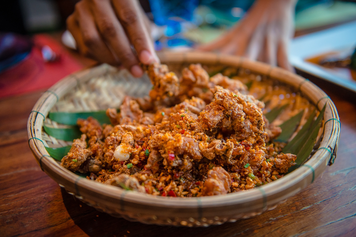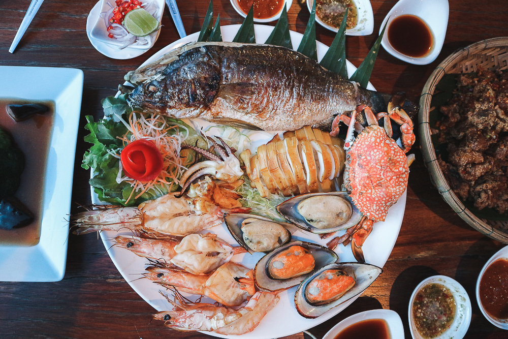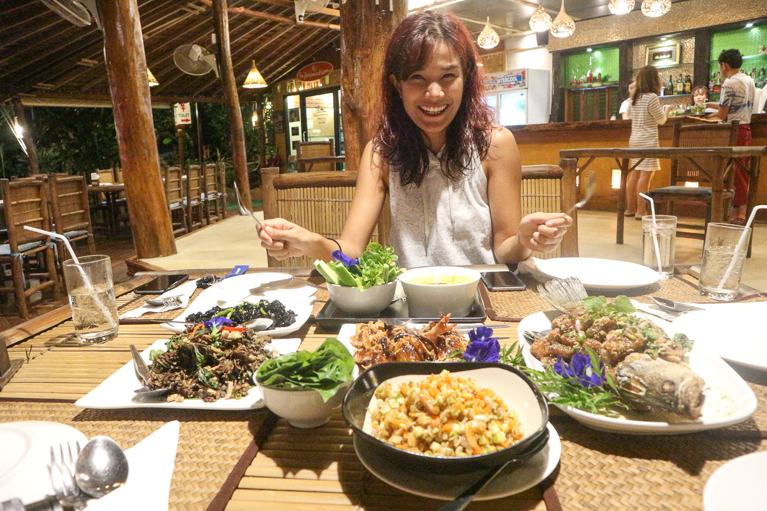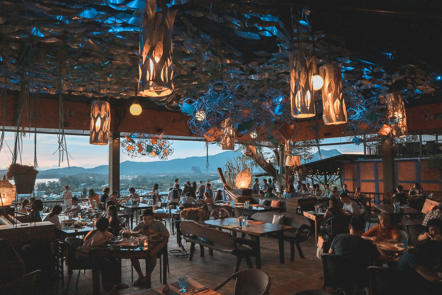 สำหรับอาหารเย็นในวันนี้ พวกเราไปทานกันที่ร้านอาหาร “แล เล กริล Lae Lay Grill” ตั้งอยู่บนเนินเขาในอ่าวนางนี่แหละ วิวดีสามารถมองเห็นวิวพระอาทิตย์ตกดินได้สวยงามมากๆ ร้านตกแต่งด้วยโคมไฟรูปปะการัง และเพดานเป็นเหมือนฝูงปลาว่ายเวียน เค้าบอกว่าวัสดุที่ใช้ตกแต่งเนี่ยรีไซเคิลจากทะเล ในร้านมีเมนูซีฟู๊ด ทั้งกุ้ง หอย ปู ปลา จะเผาหรือจะฟิวชั่นก็ได้ รับรองว่าสดมาก เพราะระหว่างเดินขึ้นมาชั้นอาหาร มีตู้เก็บปลาให้เห็นด้วย เค้าบอกว่า เราสามารถเลือกสดๆ แล้วก็เอาให้พ่อครัวทำใด้เลย