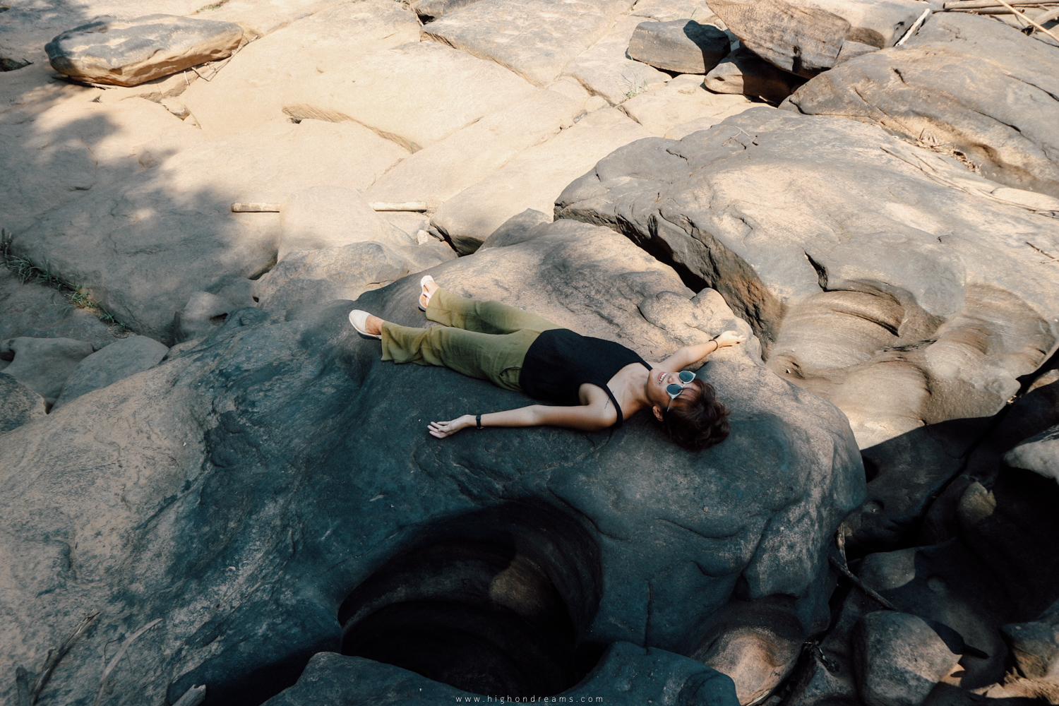 ปรากฏว่าไม่มีน้ำจ้า คือการเที่ยวน้ำตกในฤดูร้อนเนี่ยจะต้องลุ้นนิดนึงว่าจะมีน้ำมั้ย แต่เราว่าแบบไม่มีน้ำนี้มันก็ได้ฟีลไปอีกแบบ ได้ไปนั่งบนสันทางไหลของน้ำตกนั้นแล้วรู้สึกคูลชะมัด เพราะถ้าน้ำไหลมาคงไม่มีโอกาสได้ภาพแบบนี้แน่ๆ แล้วเราก็ได้เห็นเต็มๆตาว่าจริงๆหินภายใต้น้ำตกอะ มันสวยขนาดไหน
