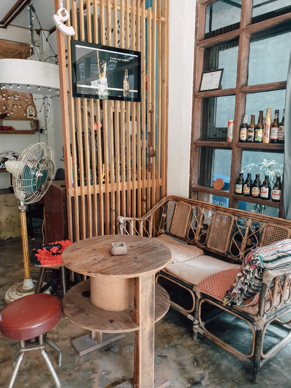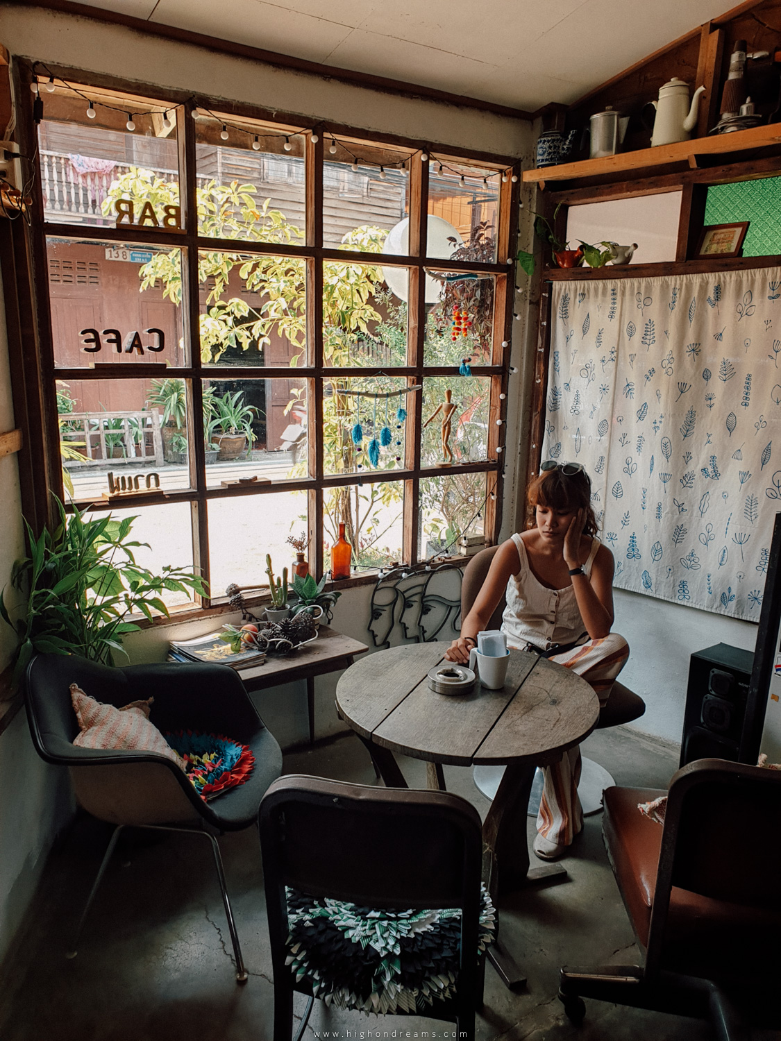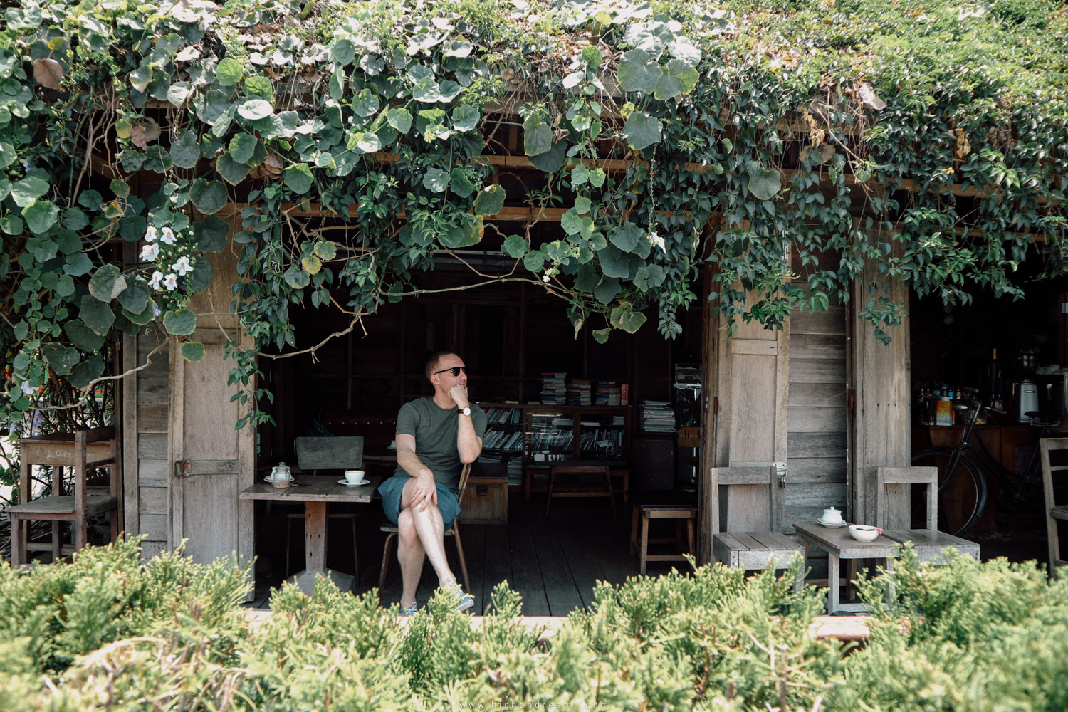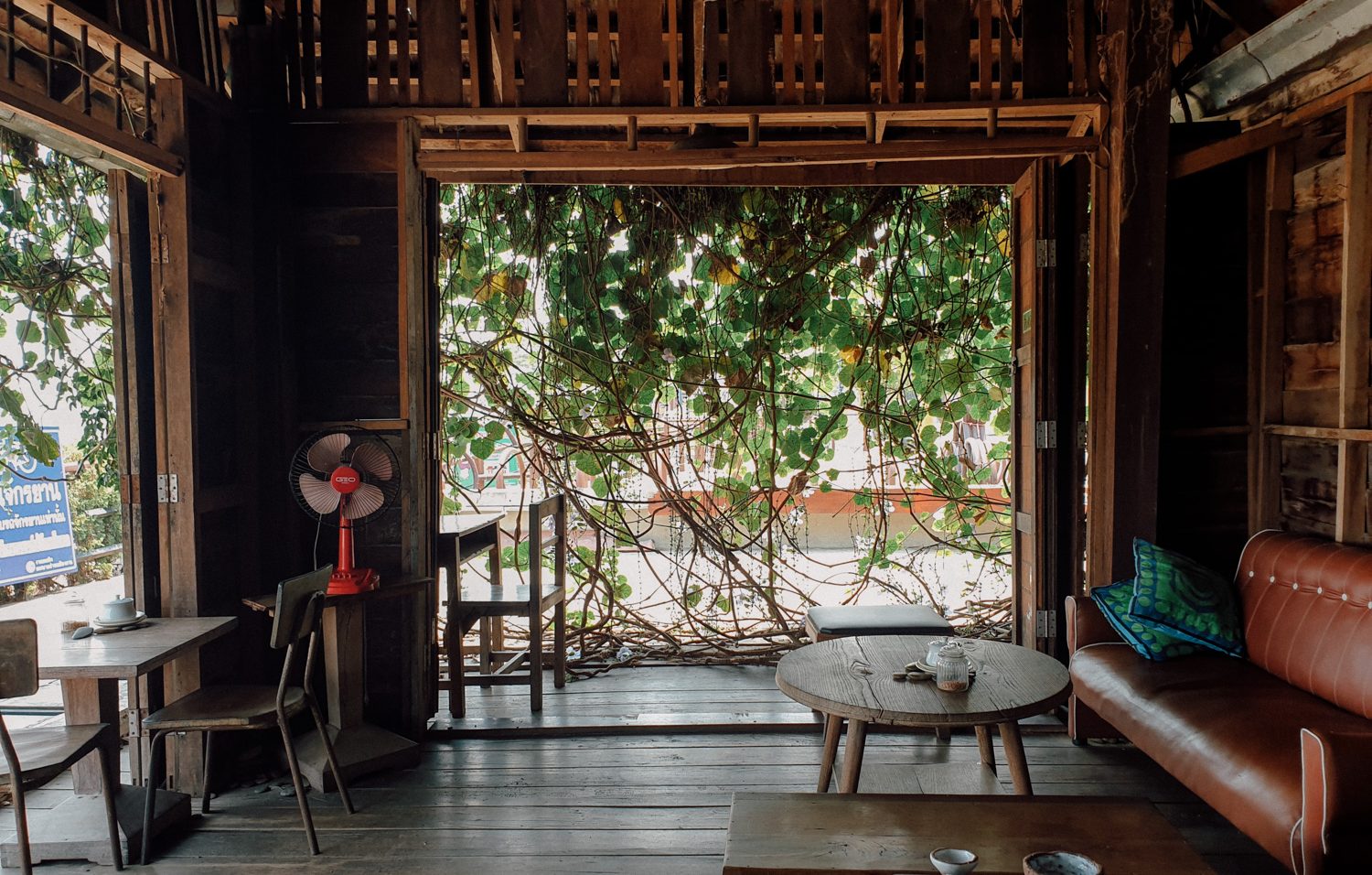 แถวๆถนนคนเดินเชียงคานมีคาเฟ่หนึ่งเตะตาเรามากๆเพราะมีหลังคาที่ถูกคลุมไปด้วยสีเขียวจากใบไม้หรือใบอะไรก็ไม่รู้ตั้งอยุ่ตรงหัวมุมก่อนจะเข้าซอยเลียบโขงตอนเข้าร้านต้องมุดๆหน่อยนึงได้ฟีลHidden Cafe ข้างในจะรู้สึกร่มรื่นเพราะใบๆมันปิดทางเข้าเอาไว้ส่วนนึงเอ้าสั่งกาแฟจิบบลูโซดาแก้กระหายหน่อยเร้ว
