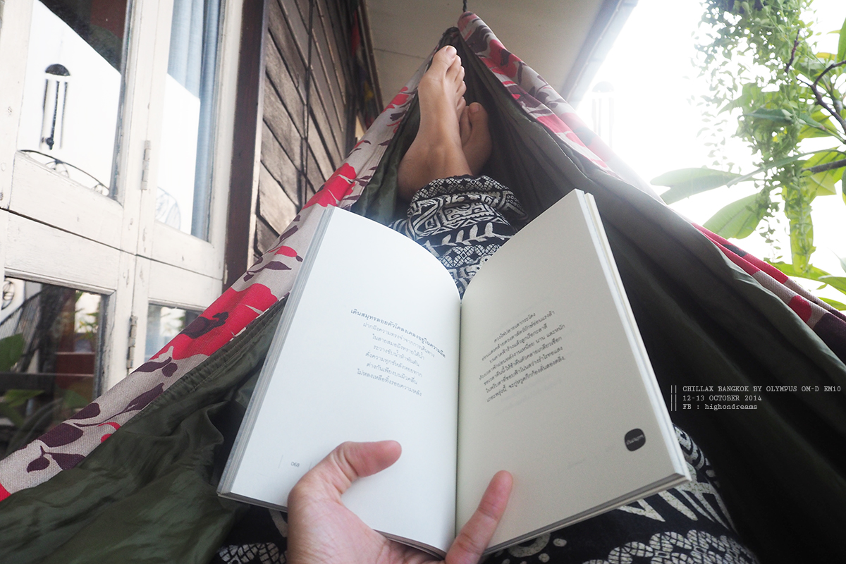 ตื่นเช้าที่สุดในรอบเดือน ออกมานั่งอ่านหนังสือริมระเบียงห้อง เพิ่งเห็นด้วยว่า ที่ระเบียงมีเปลให้ด้วยแหละ เช้าๆนี่มันก็อากาศดีเนอะ ไม่อยากให้บ่ายเลย