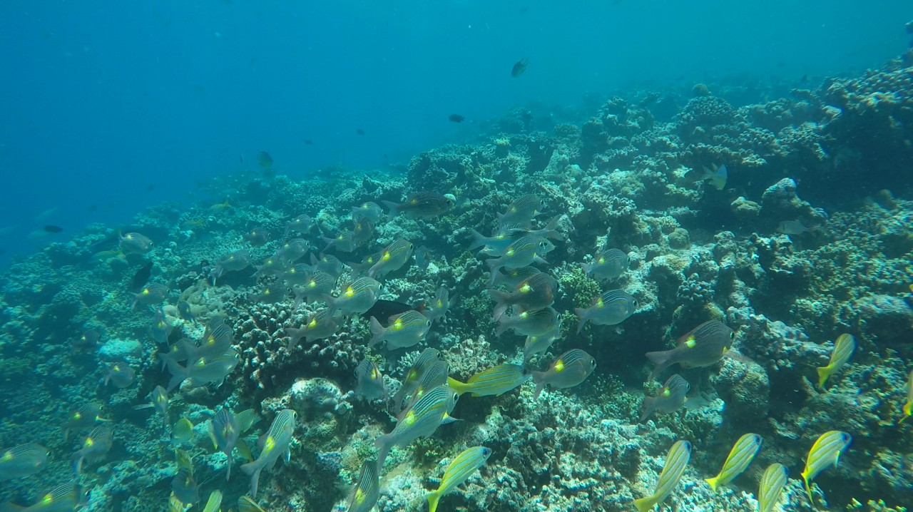 ภูมิประเทศใต้น้ำของที่นี่จะไม่เหมือนที่ไหนๆ เพราะจุดที่ปะการังเยอะสุด สวยสุด ต้องว่ายออกไปจนถึงเหว เราก็ว่ายเลาะขอบเหวนั้นไปค่ะ (คือน้ำตื้นอยู่ดีๆ ก็ลึกลงไปเลยไม่เห็นพื้น ก็เลยเรียกว่าเหว)