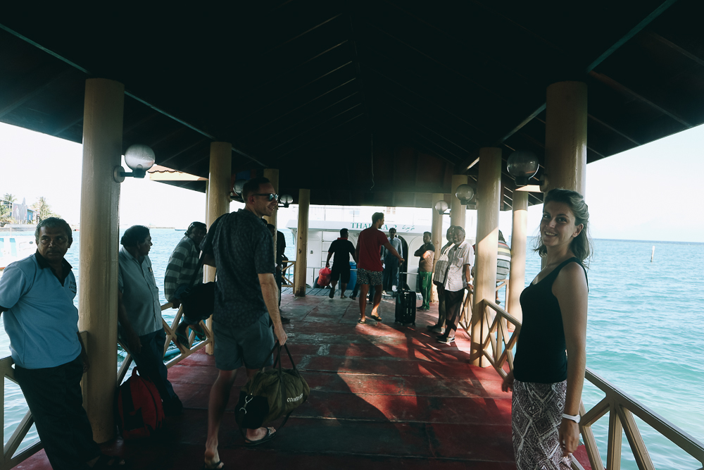 ต้องทำความเข้าใจก่อนว่า สนามบินอยู่คนละเกาะกับมาเล ซึ่งเป็นเมืองหลวง มาเลเป็นท่าเรือหลักที่จะไปเกาะต่างๆได้ เราต้องนั่งเรือจากสนามบินไปมาเลก่อน คนละ $1 เรือออกทุก 15 นาที ใช้เวลา 15 นาทีก็ถึงมาเล ทุกๆ Local Island จะมีเรือ Ferry ($2-3/31-46MVR) และ Public speed boat ($25-30) ราคาแล้วแต่ระยะทาง ที่เรือออกตรงเวลามาก เช็คกับที่พักมาให้ดีว่าต้องขึ้นเรือที่ท่าเรือไหน ของเราเลือก ferry ดิ ถูกกว่าเห็นๆ ไปเกาะ Thuludhoo ขึ้นที่ JETTY 1 มีรอบ 9.00 และ 15.30 จะเดินไปก็ได้แหละ แต่เราขึ้นแทกซี่ไปเพราะคิดว่าไกล (จ่ายไป 30MVR)