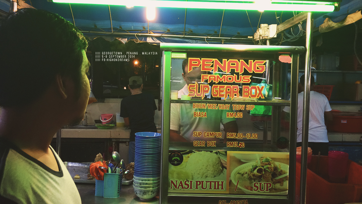 เห็นโต๊ะข้างๆ ถือชามน้ำซุปกระดูกอย่างใหญ่มาวางที่โต๊ะ มันไม่ใช่น้ำซุปกระดูกธรรมดานะ มันคือโ ค ต รกระดูก กระดูกใหญ่มากจนล้นชาม จะว่าอิ่มก็อิ่ม แต่มันก็อยากลอง เลยเดินไปหาร้านต้นฉบับที่มาของซุปชามนี้ ได้ความว่า SUP GEAR BOX ชามละ 20RM!!! 200 บาทนี่กลับไปกินบะหมี่จูเลียได้เกือบ 7 ชามเลยนะเว้ยยยย อีกอย่าง เงินที่เราสองคนแลกมาก็ใกล้จะหมดแล้ว…