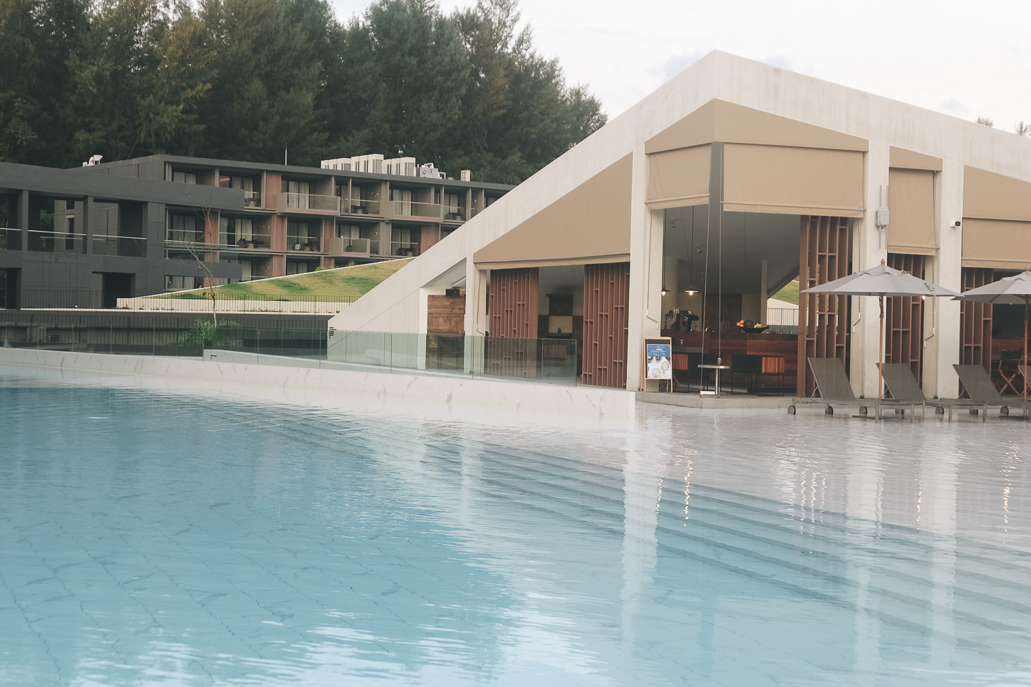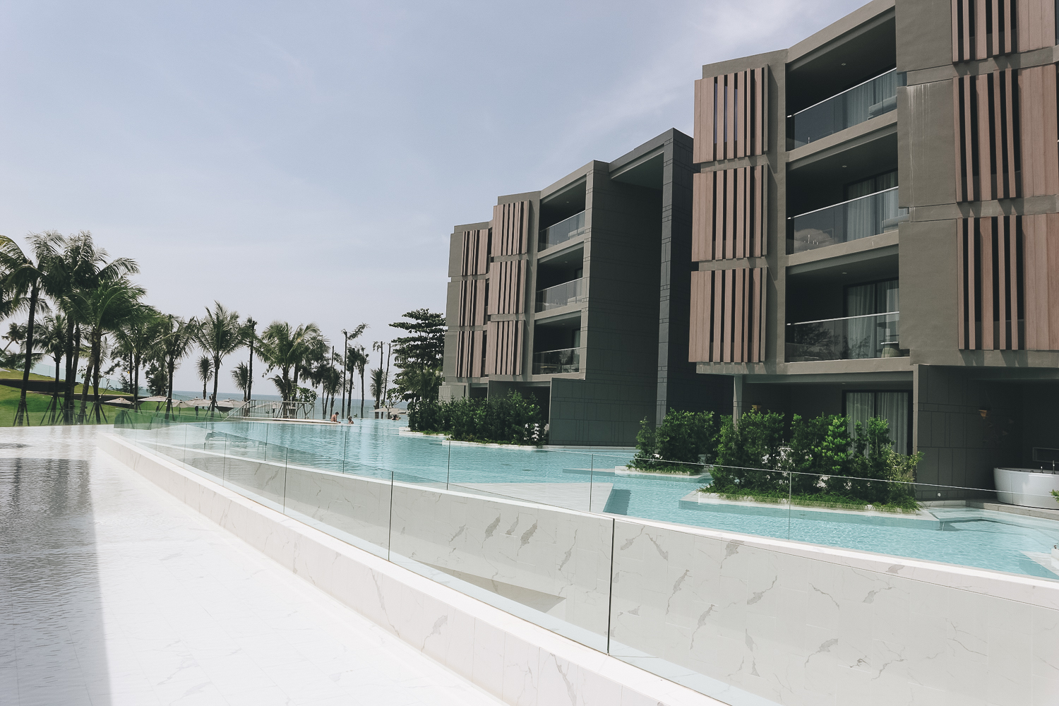 ตัวอาคารมีกี่ตึกไม่รู้ รู้แต่มีสระว่ายน้ำ 3 ส่วน คือสำหรับที่พักในแต่ละเฟส และสระว่ายน้ำโซนริมหาด