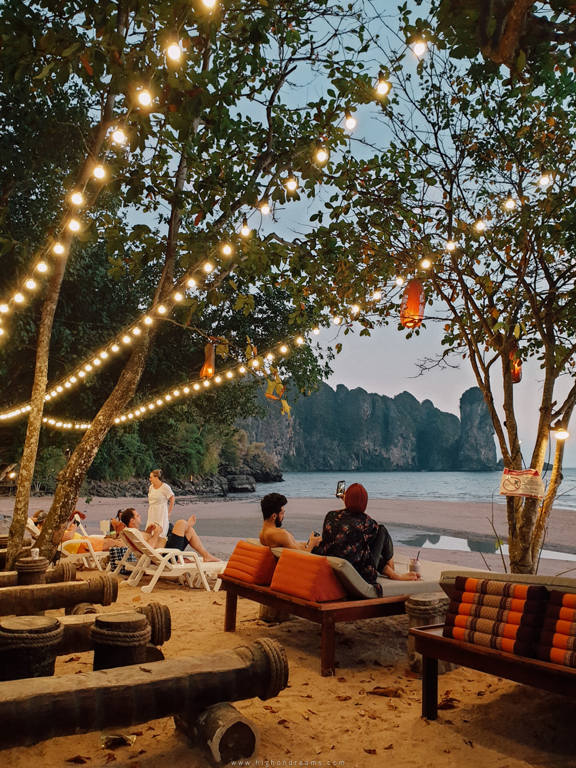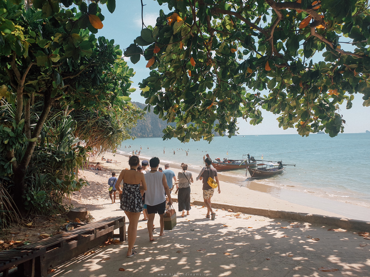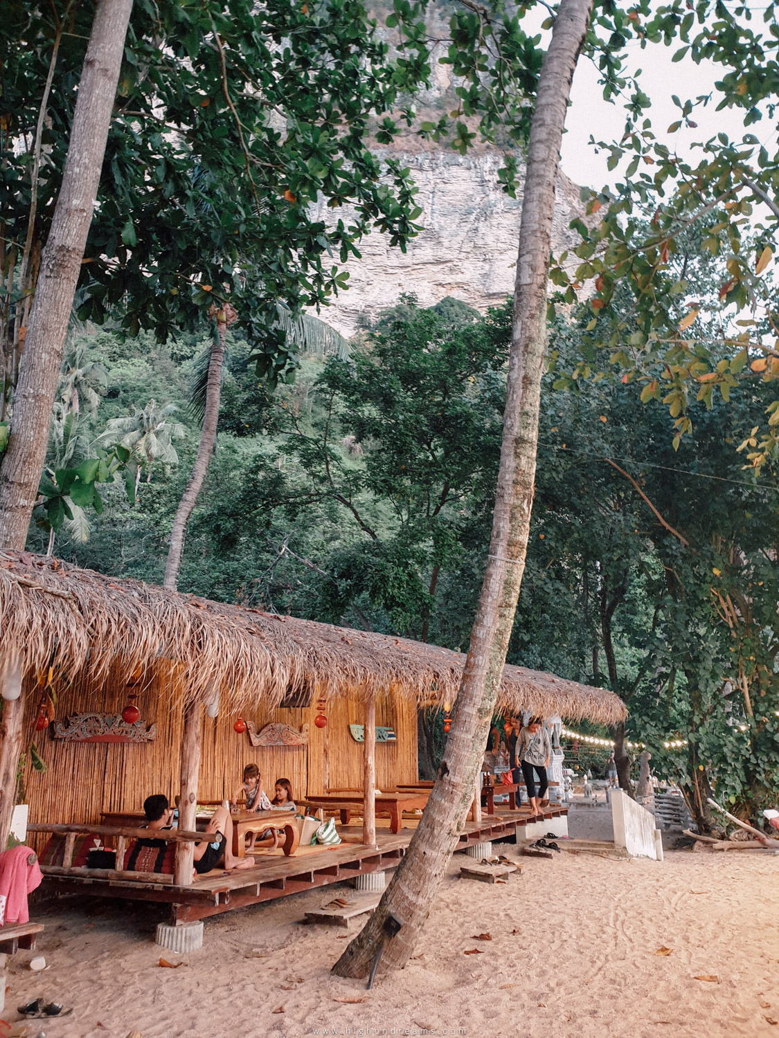 ที่นี่เราขอเรียกว่าเป็น Hippie Town เลย มันลึก มันดิบ แต่มันก็น่าค้นหา มันเหมือนเราหลงไปในเผ่าอะไรซักอย่าง มีกลิ่นที่ไม่คุ้นเคย มีแคมป์ไซด์ มีบังกาโล มีเรกเก้บาร์ เรามีโอกาสแวะมาแค่แปปเดียว ครั้งหน้าอาจจะลองมาพักในย่านนี้ดู เราสามารถเดินจากหาดไร่เลย์ตะวันตกได้ แต่อาจจะลำบากหน่อย เดินผ่านป่าผ่านดง หรือไม่งั้นก็รอช่วงน้ำลงถึงจะเดินข้ามหาดได้ ยังไม่หมดนะ จากหน้าหาดต้นไทร ต้องเดินผ่านป่ามะพร้าวลึกเข้าไปอีกนิดนึง จะเจอกำแพง แล้วเราต้องปีนกำแพงนั้น นั่นแหละ เจอหมู่บ้านจะซ่อนอยู่หลังกำแพง ทำไมต้องทำให้มันลึกลับขนาดนี้ก็ไม่รู้