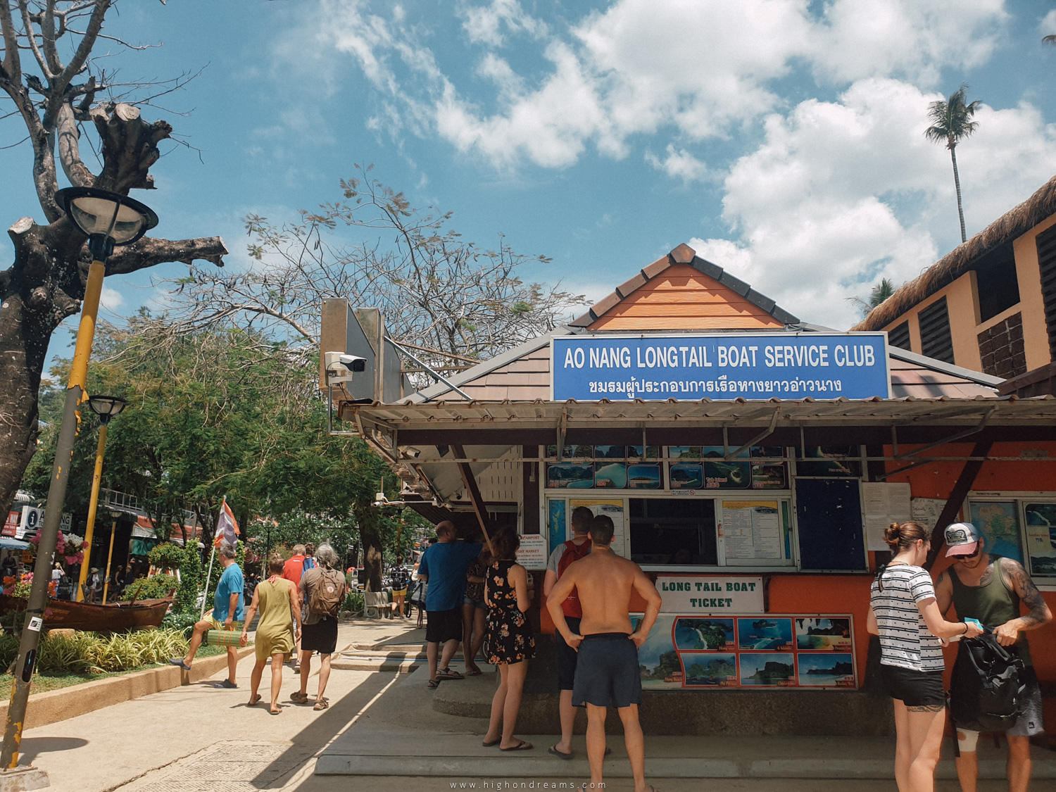 มันมีศาลาขายตั๋วเขียนว่า ชมรมผู้ประกอบการเรือหางยาวอ่าวนาง ราคาเที่ยวละ 100 บาท หรือไปกลับ 150 บาทต่อคน รอคนเต็มเรือ ประมาณ 5-8 คน เรือถึงจะออก โดยเรือจะจอด 3 จุด คือ หาดต้นไทร หาดไร่เลย์ตะวันตก และหาดถ้ำพระนาง แจ้งคนขับเรือด้วยว่าจะไปลง ไหน เรือหมด 6 โมงเย็นเด้อ (หลัง 6 โมงเย็น คิดเงินเพิ่ม)