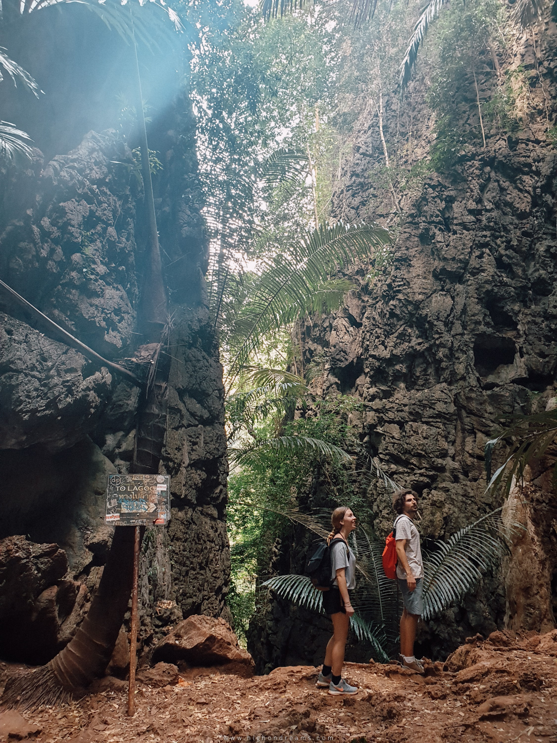 นี่คือทางขึ้น แผ่นฟ้าๆที่ติดอยู่บนต้นไม้นั่นคือป้ายบอกทางไป Viewpiont & Lagoon นี่ถ้าไม่เห็นคนกำลังปีนขึ้นไป เราก็ไม่รู้หรอกว่ามันคือทางขึ้นไปชมวิว เราต้องจับเชือกปีนขึ้นไปตั้งแต่ทางขึ้นกันเลย เค้ามีข้อห้ามอยู่คือห้ามปีนขึ้นตอนฝนตก และหลังพระอาทิตย์ตกดิน เพราะอาจเกิดอันตรายได้