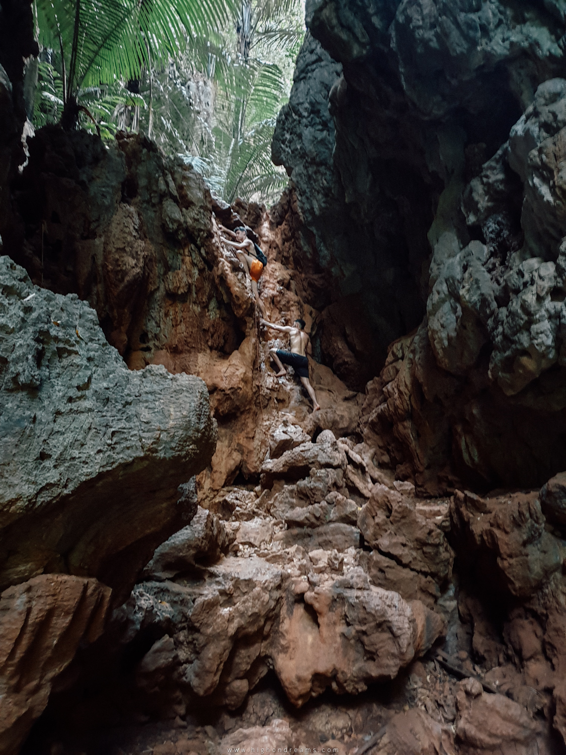 จากฝั่งถ้ำพระนางเดินผ่านหาดมาอีกฝั่งนึง จะเจอกลุ่มนักปีนเขาระหว่างทางประปราย ทั้งที่อยู่บนดิน และอยู่บนฟ้า และถัดมาเป็นโถงทางเข้าถ้ำใหญ่มากๆ ปีนๆไต่ๆอีกแล้ว ดินในถ้ำลื่นมาก เดินสองขาแทบไม่ได้ ต้องใช้ 4 เท้าเดิน ข้างในมืด มีบรรไดบางจุด ถ้ามีไฟฉายติดหัวก็ดี